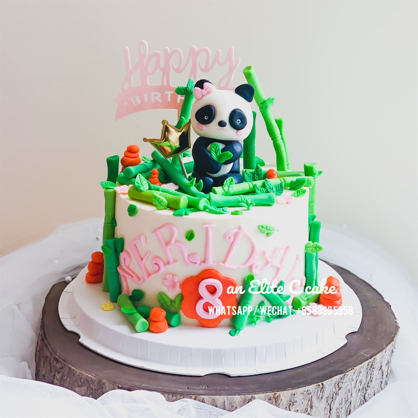 Full of fondant bamboos are resting around the panda on the cake. Pink ribbon on panda is optional.